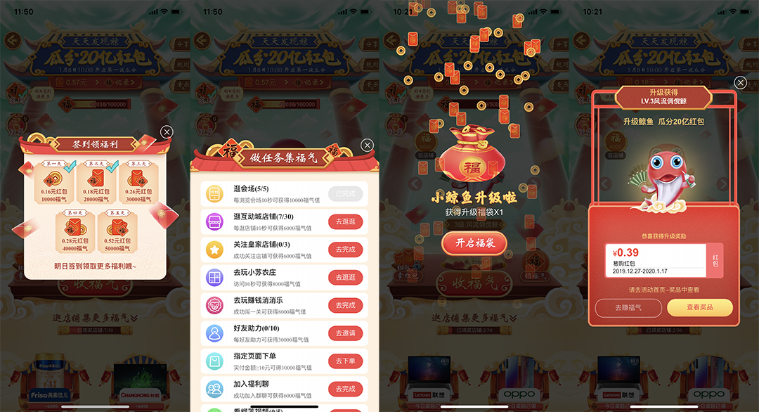 用戶通過做任務(wù)、每日簽到、逛品牌店鋪,或者訪問小蘇的農(nóng)莊、玩賺錢消消樂福利游戲均可獲得福氣值以喂養(yǎng)鯨魚,收集到的福氣值越多,福袋將變得越大,鯨魚升級也越快,可領(lǐng)取的紅包金額也越大。