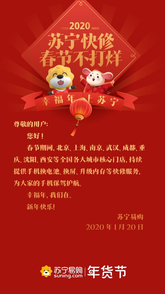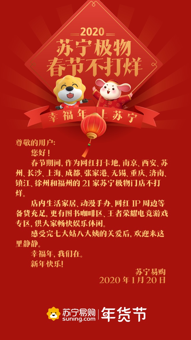 深圳新聞網(wǎng)2020年1月21日訊 春節(jié)臨近,忙著打烊成為了商家常態(tài)。有意思的是,1月20日,蘇寧連發(fā)9條通知,廣而告之“不打烊”。通知顯示,物流、蘇寧幫客、蘇寧快修、以舊換新等服務(wù)內(nèi)容,電器店、家樂福、零售云、紅孩子門店、極物等線下業(yè)態(tài)都確保不打烊、不漲價(jià)。