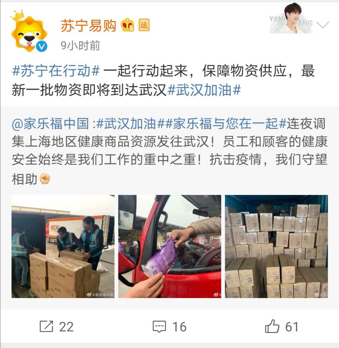 在疫情后方,不少后勤保障單位、組織也是做好了充足的準備。1月23日,蘇寧旗下家樂福中國官方微博發(fā)布了一條關(guān)于 #家樂福堅決不漲價,虧錢也不能漲!#的微博表示,家樂福中國管理團隊承諾春節(jié)期間民生用品不漲價,同時針對武漢及全國范圍都提前備好充足貨量,誓與全國人民一起共渡難關(guān)。