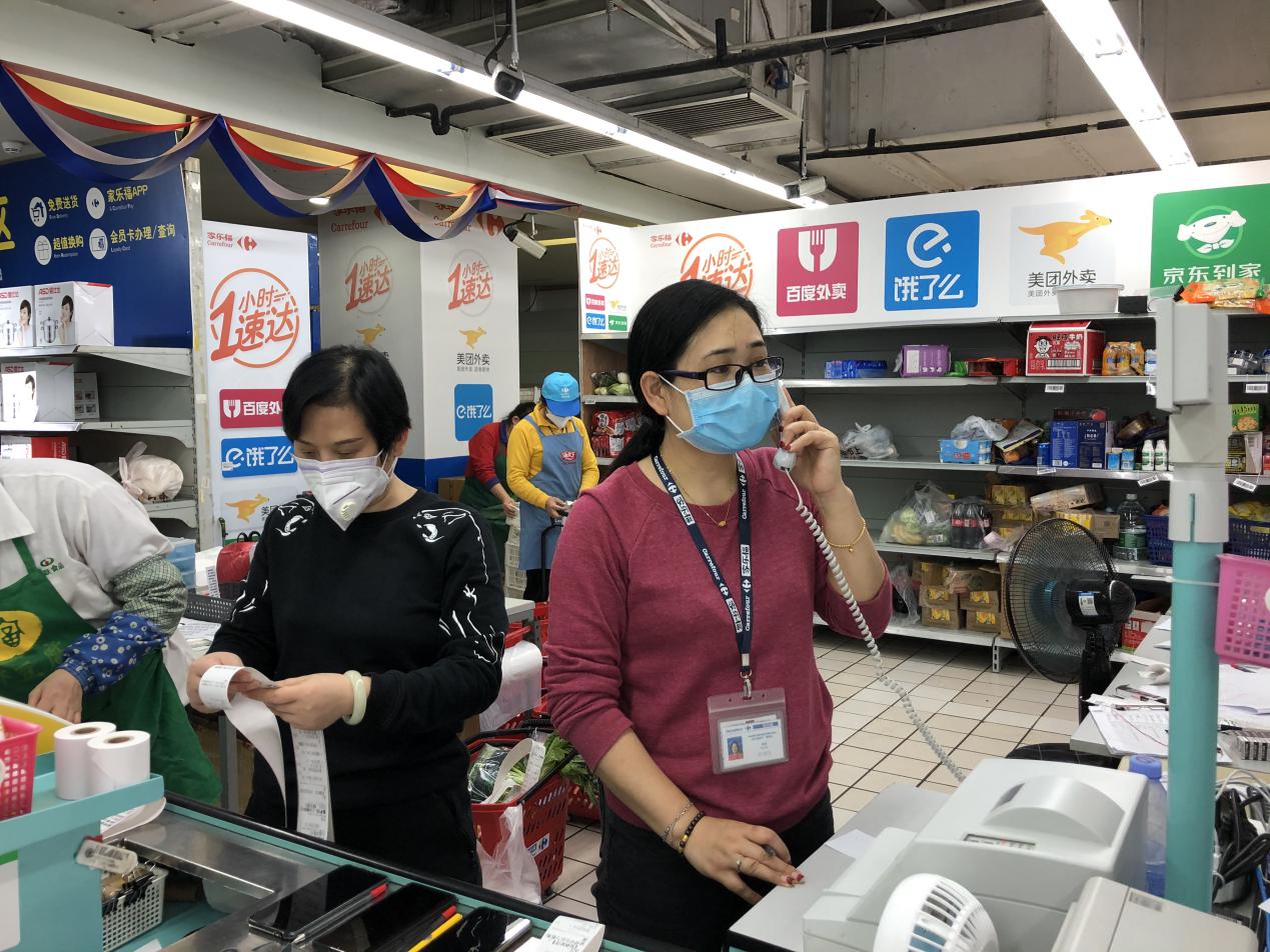 “最近十幾天,我們每天都要工作12個小時以上?!闭f這話的正是家樂福深圳梅林店的電商主管王立華,由她帶領的5人小團隊肩負起該店“配送到家”服務的揀貨、核單、打包、確認、與騎手交貨等工作。疫情當前為避開人群,更多的市民選擇在線上外賣平臺訂購超市的商品配送到家,因此超市的線上訂單猛增。為了實現(xiàn)“1小時速達”的承諾,避免訂單超時,王立華要求團隊從出單到打包好不能超過20分鐘,每天過手的各類商品有上千件?!凹覙犯C妨值甑馁u場面積大概是5000平方米,每天上下樓跑多少趟具體倒是沒有統(tǒng)計過,但像現(xiàn)在特殊時期,我們一天在網(wǎng)上接到的‘配送到家’服務訂單基本都要超過800單,有時候會到1000單?!蓖趿⑷A回答記者時,額頭上一直有細密的汗珠,聲音也有點沙啞了。