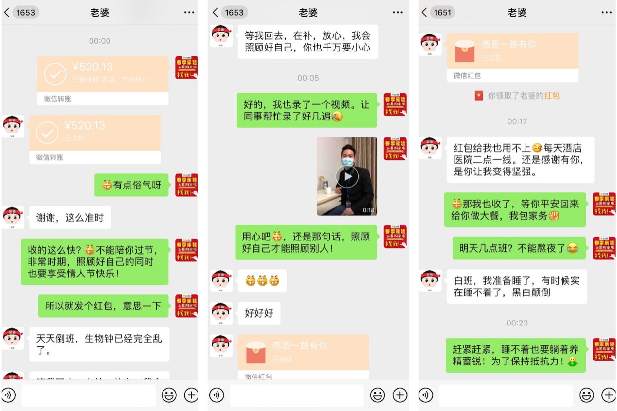 妻子也回贈(zèng)了紅包,說(shuō):“感謝有你,是你讓我變得堅(jiān)強(qiáng)。”盡管疫情讓他們相隔千里,但愛情始終連接著彼此的心。