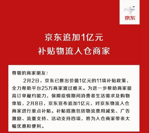 “為此,我們也向京東25萬商家推出了11項(xiàng)補(bǔ)貼扶持政策,涵蓋費(fèi)用減免、金融和物流支持、健康保障等等,希望與商家共度難關(guān),此項(xiàng)政策預(yù)計投入將超過1億元,尤其對湖北地區(qū)商家進(jìn)行了重點(diǎn)支持,京東零售還將在確保商品供應(yīng)、穩(wěn)定商品價格、扶持中小企業(yè)等方面繼續(xù)出臺系列保障政策并持續(xù)進(jìn)行大力度投入?!毙炖渍f。