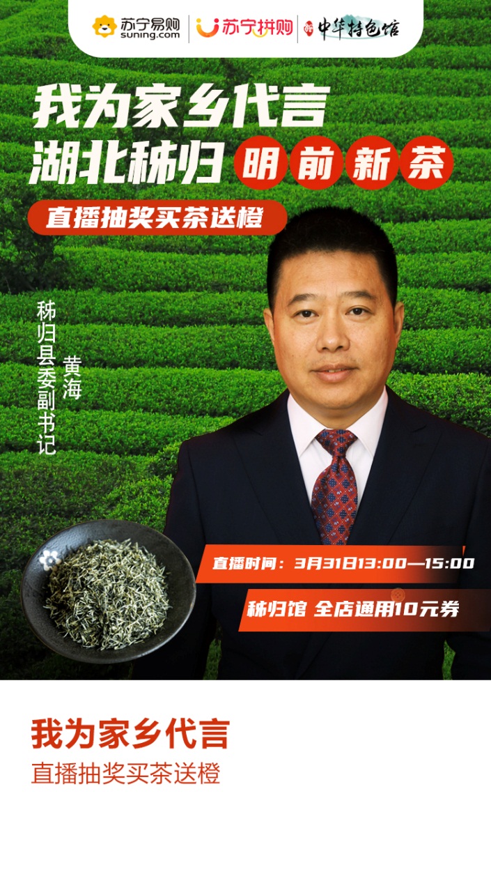 縣長直播帶貨已成風(fēng)潮,其中誕生了不少網(wǎng)紅案例。3月31日,蘇寧拼購將邀請湖北秭歸縣縣委副書記黃海亮相直播,為全網(wǎng)消費者帶來地道的秭歸農(nóng)產(chǎn)品。