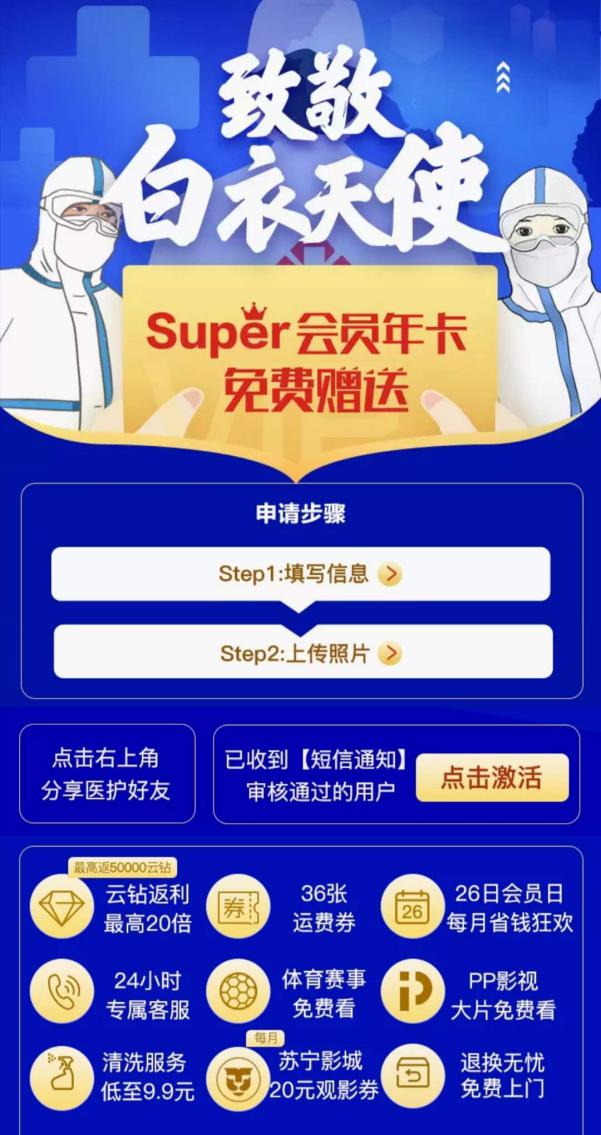 見(jiàn)圳客戶端·深圳新聞網(wǎng)2020年4月7日訊 自從3月27日蘇寧易購(gòu)為醫(yī)護(hù)人員開(kāi)放Super會(huì)員免費(fèi)申領(lǐng)活動(dòng)起,引發(fā)全國(guó)醫(yī)務(wù)工作者關(guān)注。數(shù)據(jù)顯示,3月27日-4月2日,活動(dòng)線上申請(qǐng)人數(shù)日均增長(zhǎng)59%。尤其在蘇寧易購(gòu)宣布擴(kuò)大贈(zèng)送范圍之后,藥師申請(qǐng)人數(shù)日均增長(zhǎng)達(dá)89%,技師申請(qǐng)人數(shù)日均增長(zhǎng)達(dá)145%,包括公共衛(wèi)生醫(yī)師、感染管理、心理治療師、醫(yī)院信息科工程師、救護(hù)車駕駛員等,也紛紛遞交了申請(qǐng)。