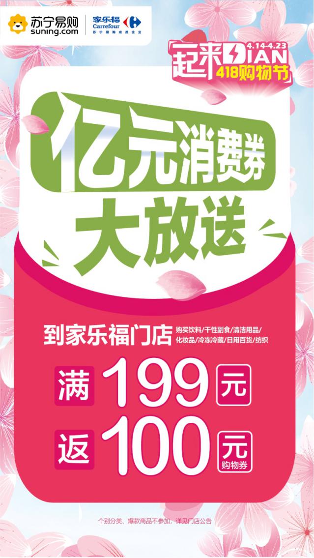 4月9日,家樂(lè)福宣布面向全國(guó)消費(fèi)者發(fā)放總額過(guò)億的家樂(lè)福消費(fèi)券,旨在提振市民消費(fèi)信心,促進(jìn)消費(fèi)回暖。“418一起來(lái)Dian”購(gòu)物節(jié)期間,凡在家樂(lè)福全國(guó)209家線下門店購(gòu)物滿199元,即可獲贈(zèng)總值100元的消費(fèi)券(5張20元消費(fèi)券),覆蓋眾多暢銷品類以及剛需民生商品(消費(fèi)券可在指定期間使用)。