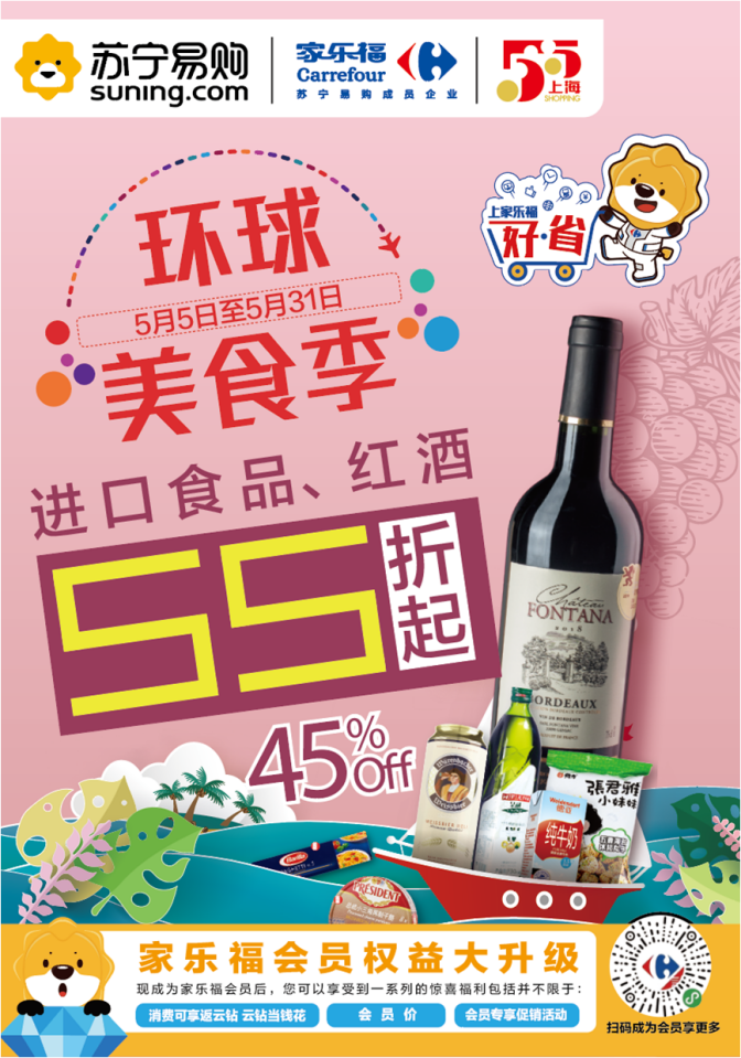 此外,家樂(lè)福方面還宣布將加大投入,全面支持上海“五五購(gòu)物節(jié),全城打折季”。5月5日至31日,上海地區(qū)家樂(lè)福門(mén)店將開(kāi)啟“環(huán)球美食季”,精選來(lái)自法國(guó)、意大利、英國(guó)、西班牙、美國(guó)、加拿大、日本、韓國(guó)、馬來(lái)西亞等39個(gè)國(guó)家的350個(gè)品牌旗下共計(jì)3700多種進(jìn)口食品,與上海消費(fèi)者共襄盛舉。美食自然少不了美酒相伴,來(lái)自法國(guó)、意大利、西班牙、阿根廷、智利、澳洲等國(guó)家的70多個(gè)品牌旗下共計(jì)200多種進(jìn)口葡萄酒,也將悉數(shù)亮相全市家樂(lè)福門(mén)店?;顒?dòng)期間,進(jìn)口食品低至5.5折起,進(jìn)口紅酒買(mǎi)一送一。進(jìn)博會(huì)“同款”法國(guó)奧格斯汀系列葡萄酒也將首次參與促銷(xiāo),葡萄酒愛(ài)好者不容錯(cuò)過(guò)。