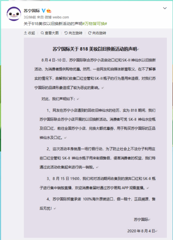 “我們的活動,原本是為了防止社會上不法分子,利用這些口紅空管和神仙水瓶子用來制假售假,侵害消費者的權(quán)益,沒想到會被部分網(wǎng)友曲解。希望消費者都能理性思考,獨立判斷,勿信謠傳謠。”蘇寧國際相關(guān)負責(zé)人表示。