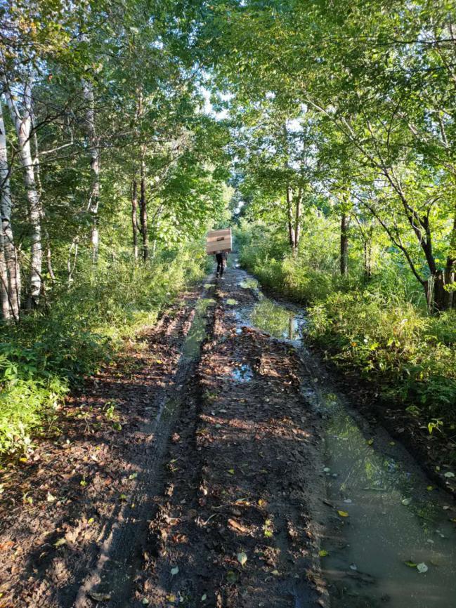 一路開下來,車身濺起不少泥垢??斓侥康牡貢r,一段泥濘的林間小路攔住了王能的去路。原來,道路積水過多,泥土過軟,車輛不能前行。王能隨即將車??吭诼愤叄苯泳砩涎澩龋钙痣娨暻靶?。兩公里的林間路,本就不輕松,扛著電視更是“難上加難”。