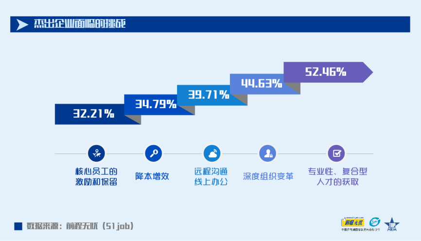 2020年杰出企業(yè)招聘員工總數(shù)較2019年增長了4.21%;55.48%的企業(yè)預計人均招聘成本呈增長趨勢,在此前提下,依然有56.04%的企業(yè)預計會在2021年擴大招聘來獲取人才優(yōu)勢。894家獲獎企業(yè)中,有469家將“為籌備未來招募新團隊,加大專業(yè)性人才和復合型人才的獲取“列為本年度企業(yè)人力資源管理所面臨的最大的挑戰(zhàn)。