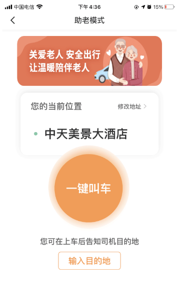 打開萬順叫車APP、小程序,醒目的助老模式按鈕,按下一鍵叫車大按鈕就能呼叫萬順叫車,無需輸入目的地,簡(jiǎn)化繁瑣叫車流程。