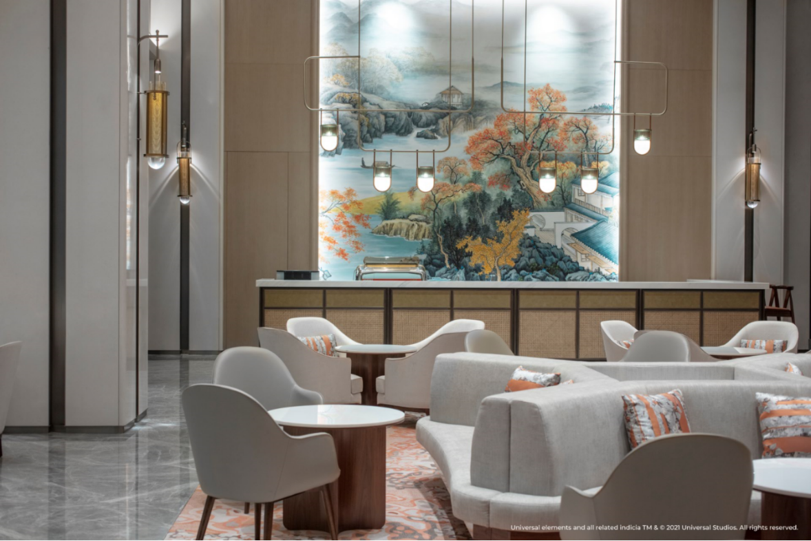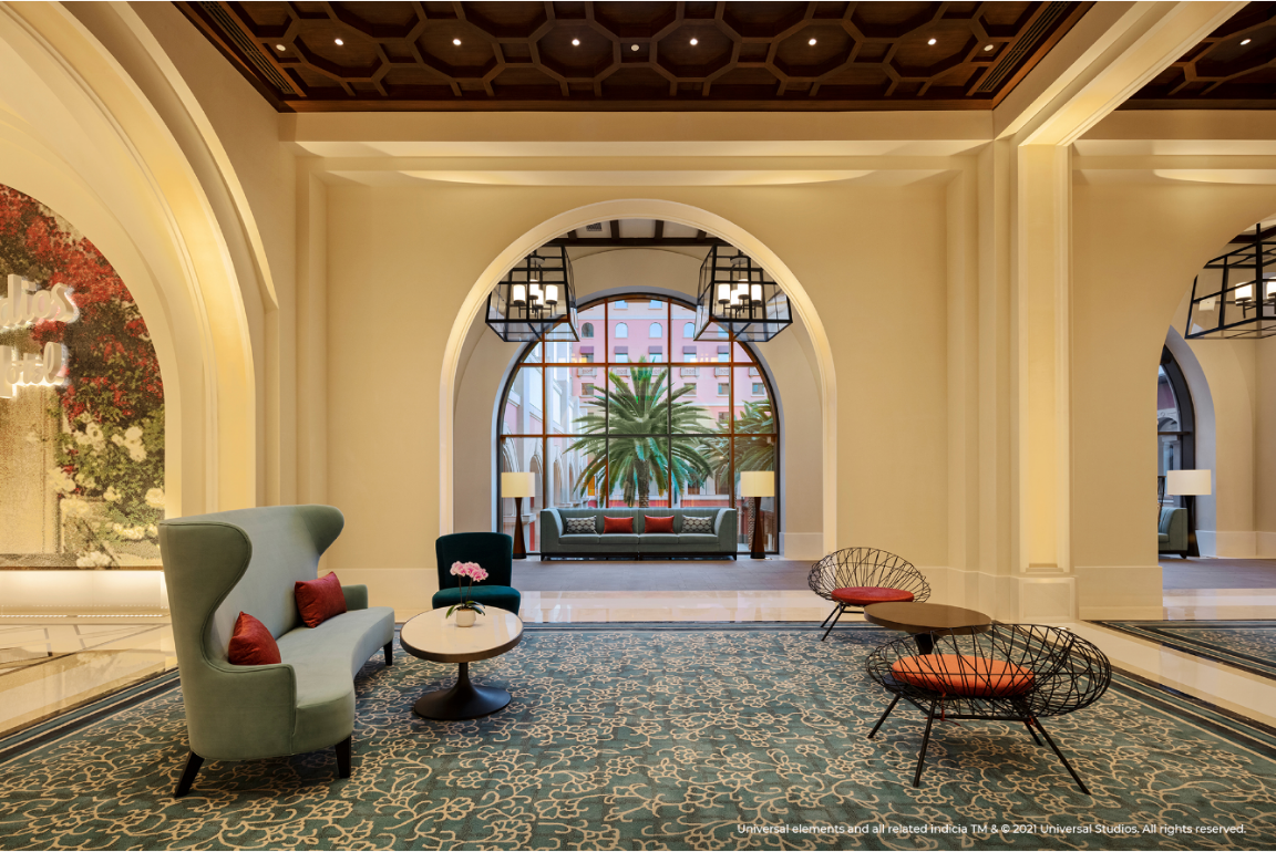 環(huán)球影城大酒店位于北京環(huán)球影城主題公園入口,入住賓客將可以俯瞰園區(qū)的絕佳景觀。作為全球首家以環(huán)球品牌命名的主題酒店,環(huán)球影城大酒店在設(shè)計中融入了極具加州特色的西班牙復(fù)興風(fēng)格,巧妙再現(xiàn)好萊塢電影黃金時代的輝煌與風(fēng)華,同時結(jié)合了中性色調(diào)的現(xiàn)代演繹以及繽紛色彩點綴。酒店大堂內(nèi)西班牙風(fēng)格的噴泉和玻璃馬賽克三角梅花墻帶來輕快靈動的熱帶海岸氣息,定制的橙花調(diào)香氛則令人仿佛置身加州,讓賓客感受到典雅而充滿活力的度假氛圍。酒店公共區(qū)域內(nèi)的珍貴電影海報將帶領(lǐng)賓客探尋動人心扉的光影世界背后,精彩絕倫卻不為人知的創(chuàng)作瞬間。從復(fù)古經(jīng)典系列,到現(xiàn)代電影杰作,更有大量的幕后花絮呈現(xiàn)一段歷久彌新的電影之旅,回溯環(huán)球超過一個世紀(jì)的電影歷史的光輝歷程,致敬品牌在光影史上的耕耘與貢獻。