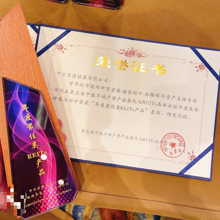 與招商蛇口申報基礎設施公募REITs同時,由中國房地產業(yè)協(xié)會聯(lián)合中國REITs聯(lián)盟等主辦的“第五屆中國不動產資產證券化與REITs高峰論壇”上,憑借申萬宏源-招商蛇口-泰格明華資產支持專項計劃,招商蛇口獲評為“最佳原始權益人”,泰格明華項目獲得“年度最佳類REITs產品”獎項。