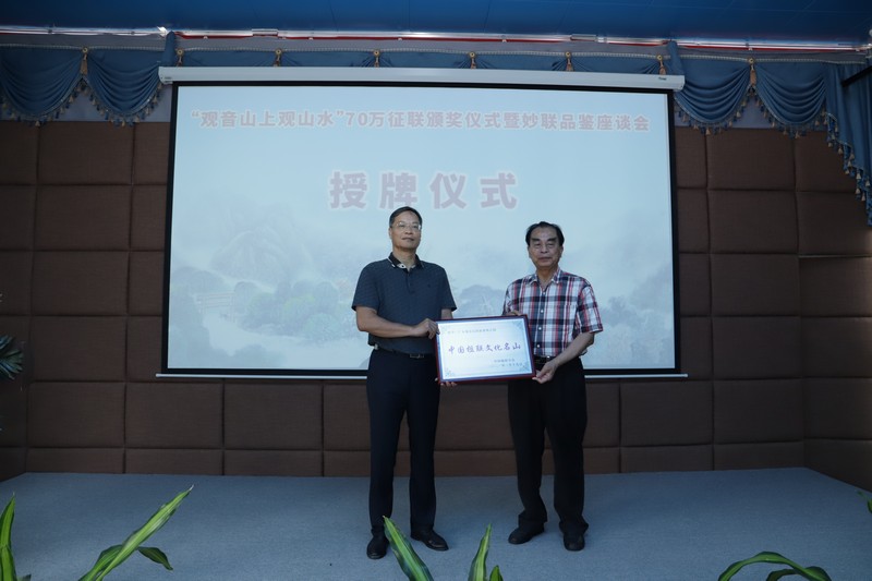 同時,經(jīng)中國楹聯(lián)學會研究決定,授予廣東觀音山國家森林公園“中國楹聯(lián)文化名山”榮譽稱號。中國楹聯(lián)學會顧問委員會副主任、中國楹聯(lián)學會原副會長、鄒繼海代表中國楹聯(lián)學會,為廣東觀音山國家森林公園授牌。