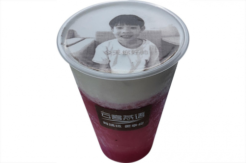 建議由孩子把自己或家人的照片加上一句話祝愿的話,作成圖片先保存到手機(jī)里。到店后,在云客茶語(yǔ)小程序上傳打印到奶茶上。整個(gè)制作過程約10分鐘。