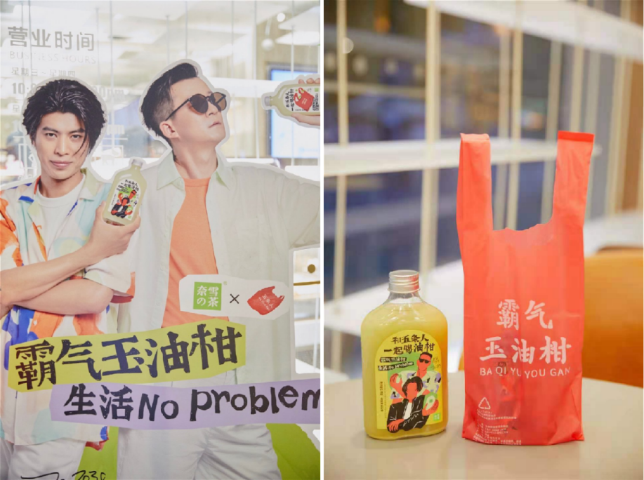 對(duì)于品牌×明星的聯(lián)名來(lái)說(shuō),調(diào)性契合是聯(lián)名活動(dòng)不可或缺的"出圈基因"。而奈雪的茶霸氣玉油柑與樂(lè)隊(duì)五條人,看似來(lái)自不同次元,實(shí)則都有大膽、堅(jiān)持、向上、樂(lè)觀的底色,而非將不搭嘎的兩個(gè)品牌生硬地“拉郎配”。奈雪還圍繞聯(lián)名別出心裁地推出了五條人主題的立牌、貼紙和堆頭,甚至將五條人標(biāo)志性的“紅色塑料袋”做成了極具個(gè)性且生物可降解的奈雪打包袋,可謂細(xì)節(jié)之處見(jiàn)真章。