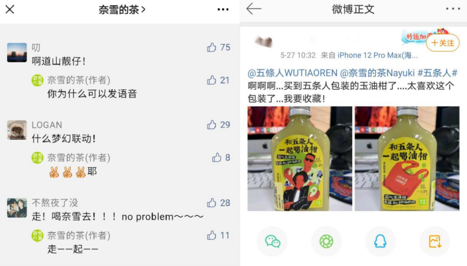 這樣“肆意妄為”的話(huà)從五條人嘴里蹦出并不稀奇,他們與生俱來(lái)的“平凡生活浪漫主義”,擅長(zhǎng)洞察事物的另一面。精妙的是,奈雪的茶洞察到用戶(hù)在日常生活中的種種焦慮,將霸氣玉油柑“先澀后甜”的特點(diǎn)比作人生滋味,用這一豁達(dá)積極的態(tài)度來(lái)輕松正能量地引導(dǎo),這一點(diǎn)與五條人的精神內(nèi)核如出一轍。5月27日奈雪的茶X五條人TVC發(fā)布后,不少網(wǎng)友表示這波是“破次元壁”的夢(mèng)幻聯(lián)動(dòng),還有網(wǎng)友在線(xiàn)分享五條人歌曲中有共鳴的歌詞。