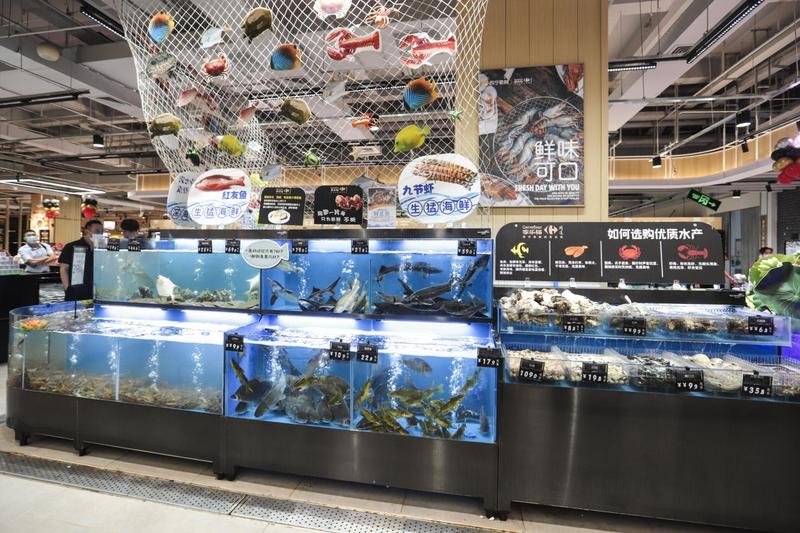 暢游的鱘魚、張牙舞爪的小龍蝦、不斷彈尾的波士頓龍蝦,生猛異常。據(jù)悉,鮮活水產(chǎn)的進(jìn)駐家樂福密謀已久。過往超市水產(chǎn)區(qū)域品類以淡水活魚與冰鮮產(chǎn)品為主,鮮活海鮮十分罕見。今年5月,家樂福與國(guó)內(nèi)龍頭合作,將來自全國(guó)各大產(chǎn)地的鮮活水產(chǎn)品,經(jīng)過抽查、驗(yàn)收、分揀等工序,每天到店,成為首家規(guī)模化啟動(dòng)鮮活海鮮自營(yíng)的雙線零售商超。