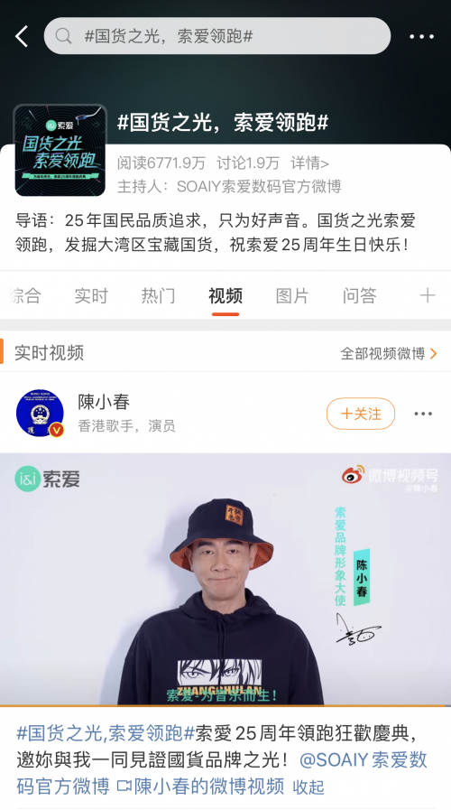 讀特客戶端·深圳新聞網2021年10月22日訊(記者 田志強)近日,索愛廣州25周年慶領跑活動在網絡持續(xù)發(fā)酵,引爆輿論熱烈關注。作為音頻數碼行業(yè)首個登錄廣州塔的國貨品牌,索愛25周年領跑活動吸引了大量的媒體和達人齊聚廣州塔,索愛品牌和產品熱度以廣州為中心迅速向周邊地域傳播。在索愛冠名高鐵、簽約陳小春夫婦為品牌形象大使等品牌事件的疊加聚合效應下,#國貨之光,索愛領跑#等話題和熱度持續(xù)傳播至各社交平臺,各個類別KOL相繼為索愛發(fā)聲,僅在微博平臺的話題閱讀量已突破數千萬。