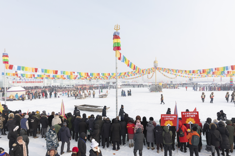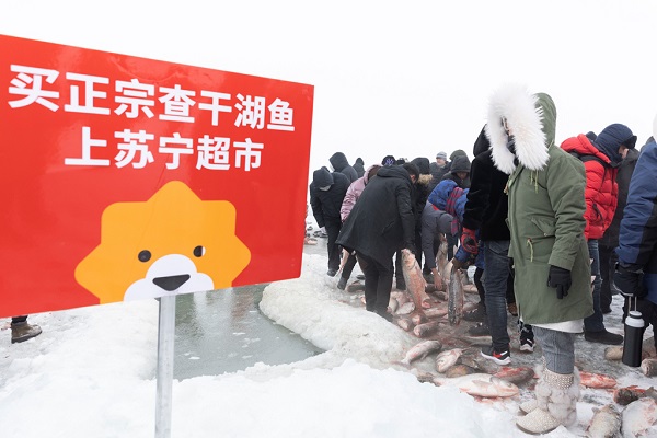 12月28日,在查干湖第十八屆冰雪漁獵文化旅游節(jié)開幕當(dāng)天,蘇寧超市在年貨節(jié)期間,遠(yuǎn)赴吉林查干湖原產(chǎn)地,為消費(fèi)者送上正宗的綠色有機(jī)查干湖胖頭魚。