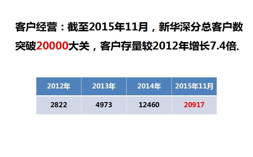 客戶經(jīng)營:截至2015年11月,新華深分總客戶數(shù)突破20000大關(guān),較2012年增長近7.4倍。