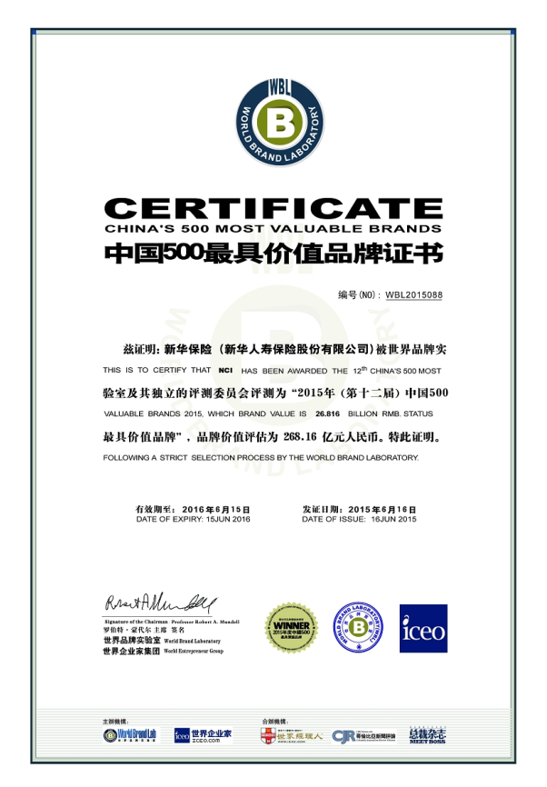 世界品牌實(shí)驗(yàn)室(World?Brand?Lab)發(fā)布2015年(第十二屆)《中國(guó)500最具價(jià)值品牌》排行榜。新華保險(xiǎn)品牌價(jià)值為268.16億元,同比提升逾40億元;位居榜單第88名,比去年晉升3位,連續(xù)三年穩(wěn)居中國(guó)前100強(qiáng)。