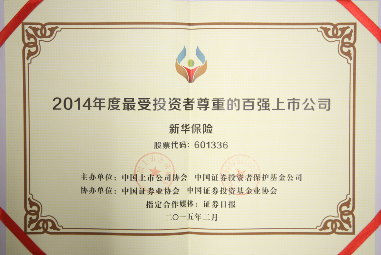 2015年2月,在中國上市公司協(xié)會(huì)、中國證券投資者保護(hù)基金公司主辦,中國證券業(yè)協(xié)會(huì)、中國證券投資基金業(yè)協(xié)會(huì)協(xié)辦的評(píng)選中,新華保險(xiǎn)獲得2014年度最受投資者尊重的百強(qiáng)上市公司。