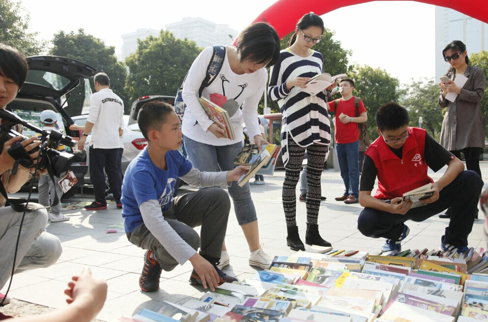 深圳市實驗中學的車尾箱展位前圍滿了前來換書的人