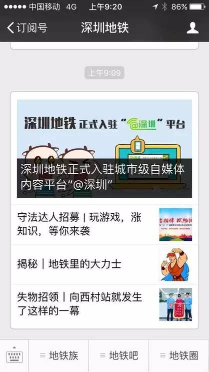 12月1日,深圳地鐵官方微信“深圳地鐵”正式入駐“@深圳”平臺(tái)。這是國(guó)內(nèi)首個(gè)城市級(jí)自媒體內(nèi)容平臺(tái)“@深圳”上線以來(lái),又一入駐的官方微信。