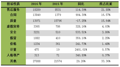 2016年投訴分類(lèi)統(tǒng)計(jì)