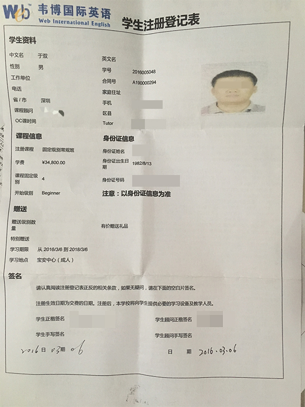 本人與韋博英語深圳寶安中心(位于海雅繽紛城)在2016年3月6日,簽訂《學生入學注冊合同》,總計學費34800元,我已經超過1年時間,但只上了六節(jié)課。詢問退款之事,回復只可轉讓,再找人,就拖延時間。