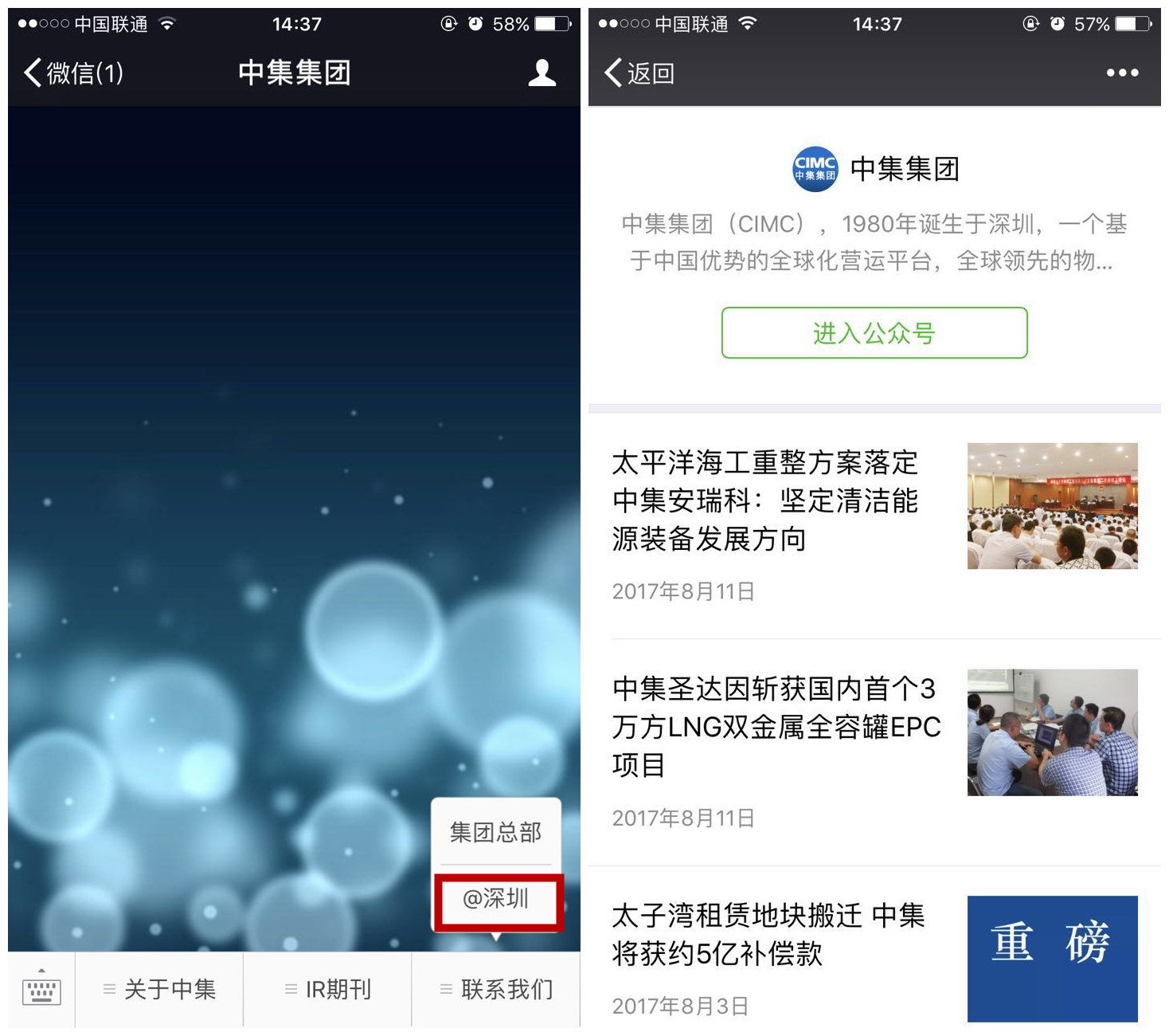 深圳新聞網(wǎng)訊(記者 陳飛)近日,中國國際海運(yùn)集裝箱(集團(tuán))股份有限公司(簡稱:中集集團(tuán))官方微信公眾號(hào)“中集集團(tuán)”正式入駐@深圳平臺(tái)。