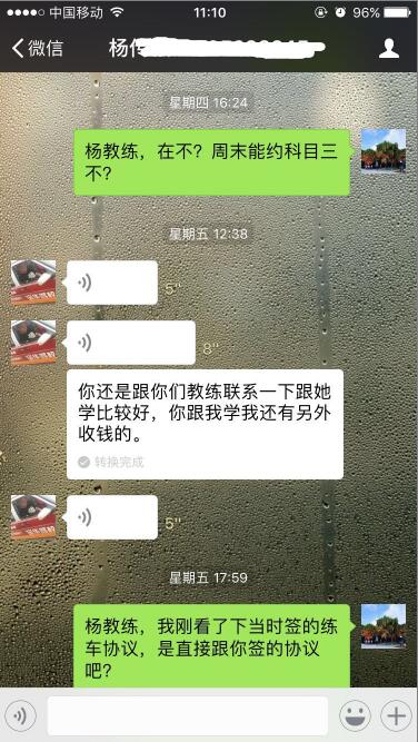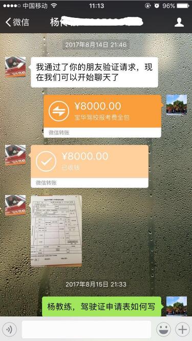 2017年8月,陳先生與寶華駕校教練員楊某銀簽《駕駛員培訓合同》,并支付了全款培訓費用8000元(見微信截圖)。2018年1月,陳先生通過科目二考試后,與楊某預約科目三考試。楊某提出要再次收費(詳見聊天記錄)。陳先生與楊某溝通無效后,向該教練掛靠的寶華駕校投訴維權,寶華駕校反應“其一,駕校不接收學員不與學員簽合同;其二,教練的投訴先調查了解”,后續(xù)再無反饋。