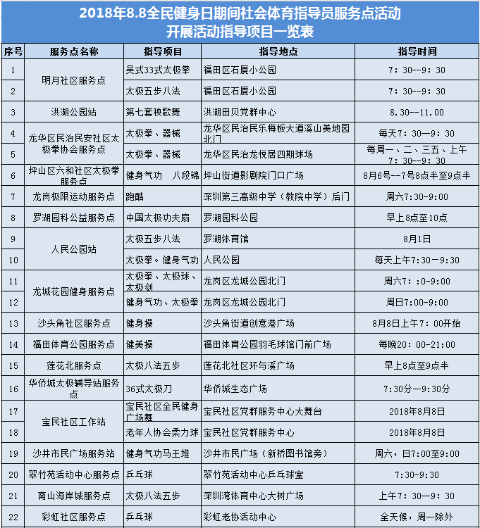 ????2018年8月8日,經(jīng)深圳市文體旅游局統(tǒng)計,在“全民健身日”期間,深圳將有近50個全民健身站點,為市民提供健身科普、大講堂、免費(fèi)咨詢及健身指導(dǎo)等,健身內(nèi)容涵蓋武術(shù)、舞蹈、健身操、球類等眾多項目。