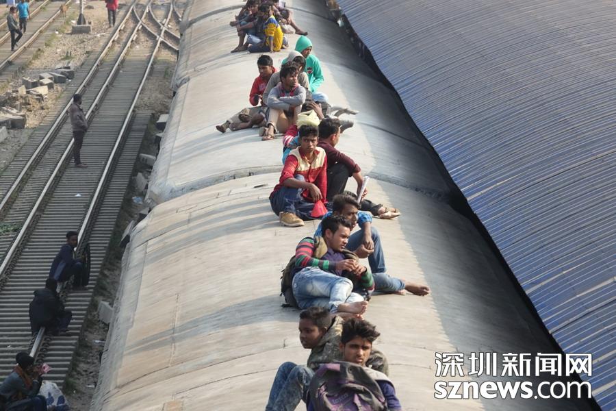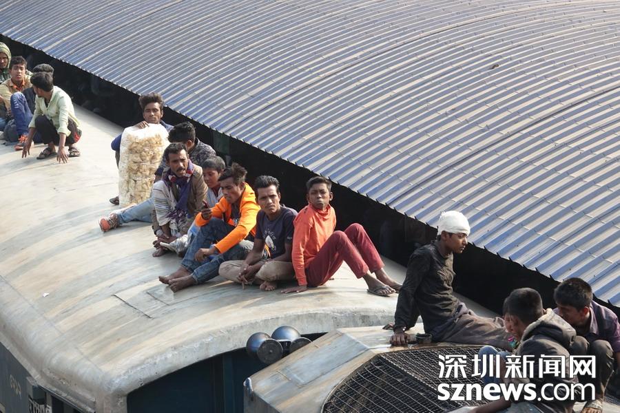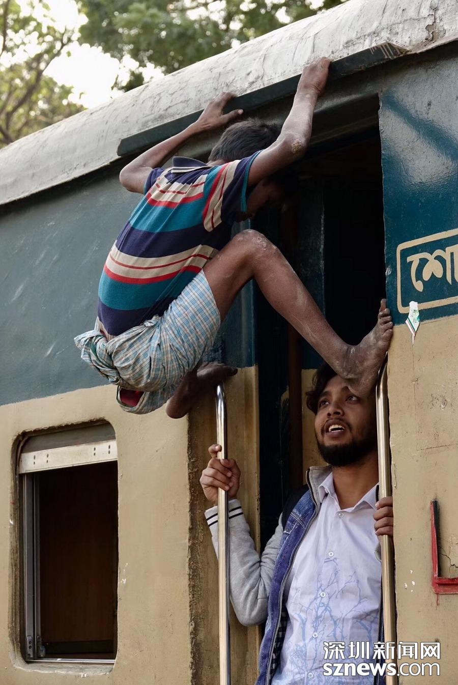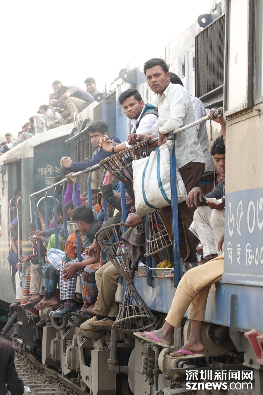 從達(dá)卡到邁門辛的火車是國內(nèi)最擁擠的線路之一,通常有數(shù)千名旅客擠在載客人數(shù)只有650人的火車?yán)?,有的抓著把手,有的蹲在門口,要不就蹲在車箱間的聯(lián)軸上或坐在車頂上。李仁奇攝