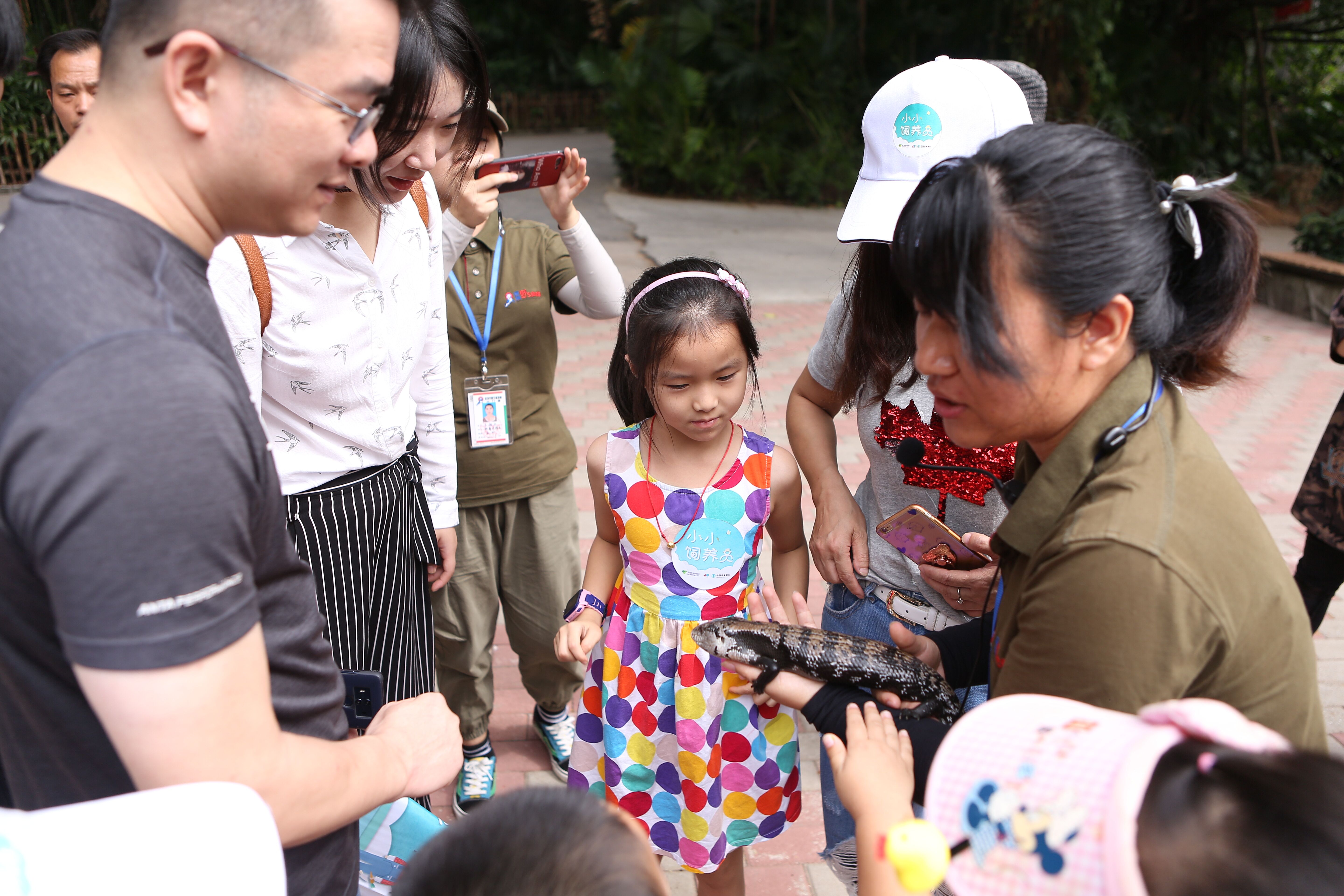 “鬃獅蜥和藍(lán)舌石龍子都是蜥蜴的一種。當(dāng)遭受威脅時(shí),鬃獅蜥會(huì)張開(kāi)嘴及將帶刺的咽喉膨起來(lái)像一頭生氣的獅子。藍(lán)舌石龍子的舌頭是藍(lán)色的,平時(shí)會(huì)不時(shí)向外一伸一伸?!毙∨笥褌冋J(rèn)真地聽(tīng)科普導(dǎo)游講解兩種蜥蜴的區(qū)別,膽大的孩子則抱起蜥蜴仔細(xì)觀察起來(lái)。