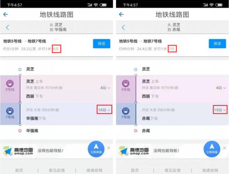 兩次乘車線路的手機(jī)截圖對比(供圖者@吾非魚)