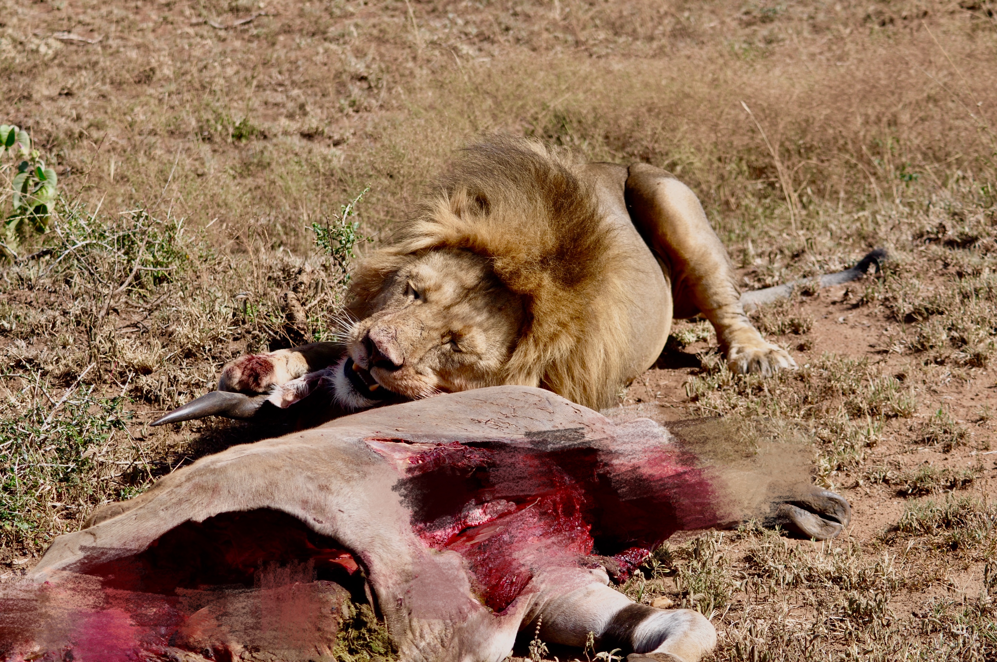作者運氣不錯,在塞倫蓋蒂巡游時巧遇一頭雄獅守護在一頭被咬死的大羚羊旁。李仁奇 攝