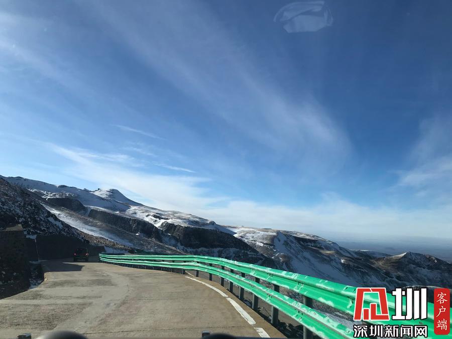 山上積雪覆蓋,與天邊的景色相互交映成一幅美麗的風景畫。