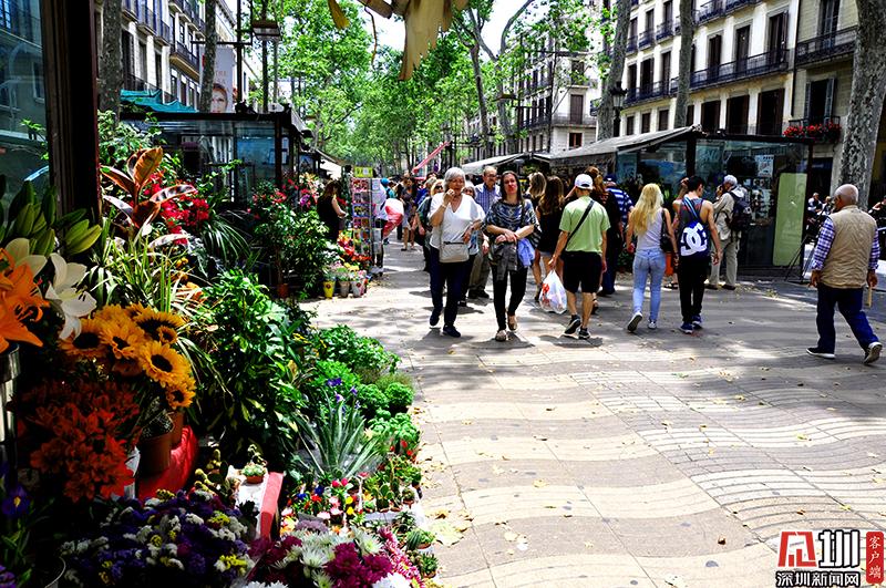 巴塞羅那舊城核心地段有一條長(zhǎng)約一公里的寬闊步行街,因其中段有一些花店,被稱為蘭布瑯花街。圖為蘭布瑯花街。李仁奇 攝
