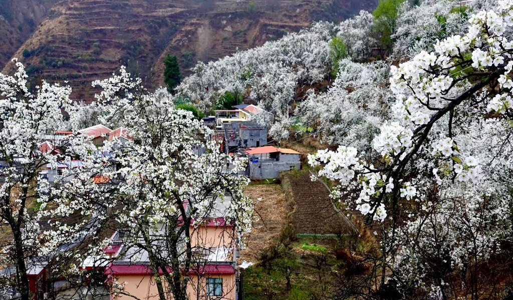 每年三到四月,金川縣的上百萬株梨樹在春日照耀下盛開白花,萬畝梨海、百里吐蕊。李仁奇 攝