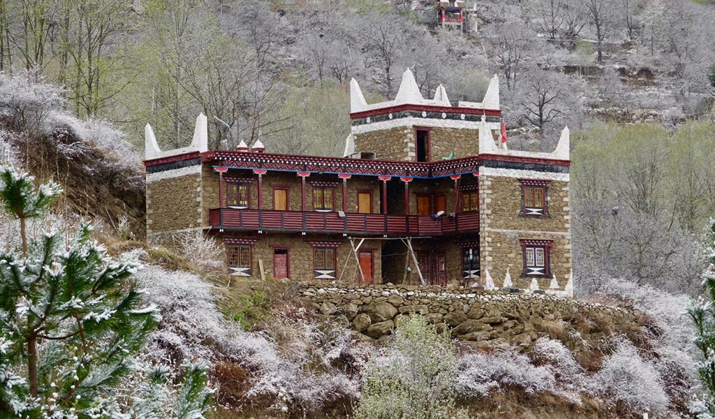 當群山還披著皚皚白雪,春寒尚未消盡,甲居藏寨的梨花卻已悄然開放。李仁奇 攝