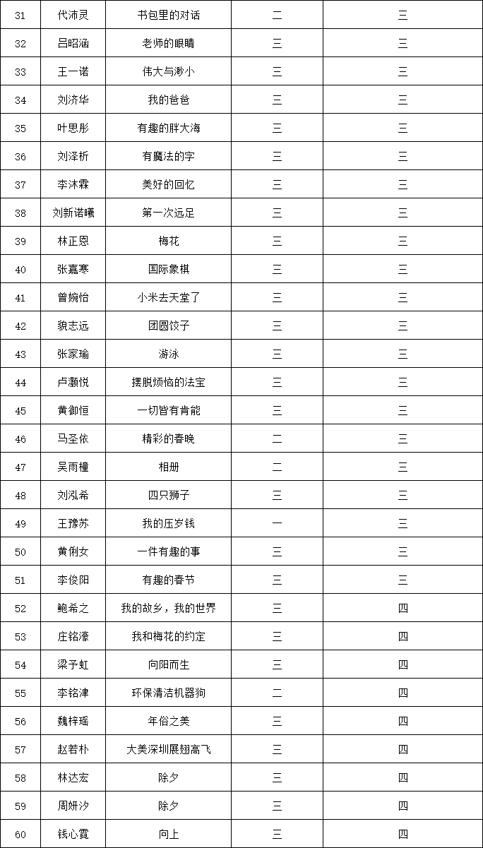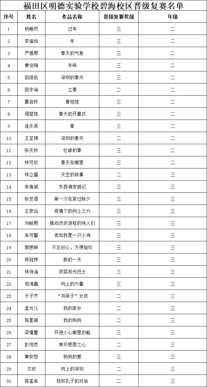 自2021年1月,活動征稿啟動以來,獲得了深圳市廣大中小學生、教師、文學愛好者的熱烈響應積極參與,吸引了深圳百余所學校的上萬人關注報名。現(xiàn)公布福田區(qū)明德實驗學校碧海校區(qū)專場晉級復賽名單如下: