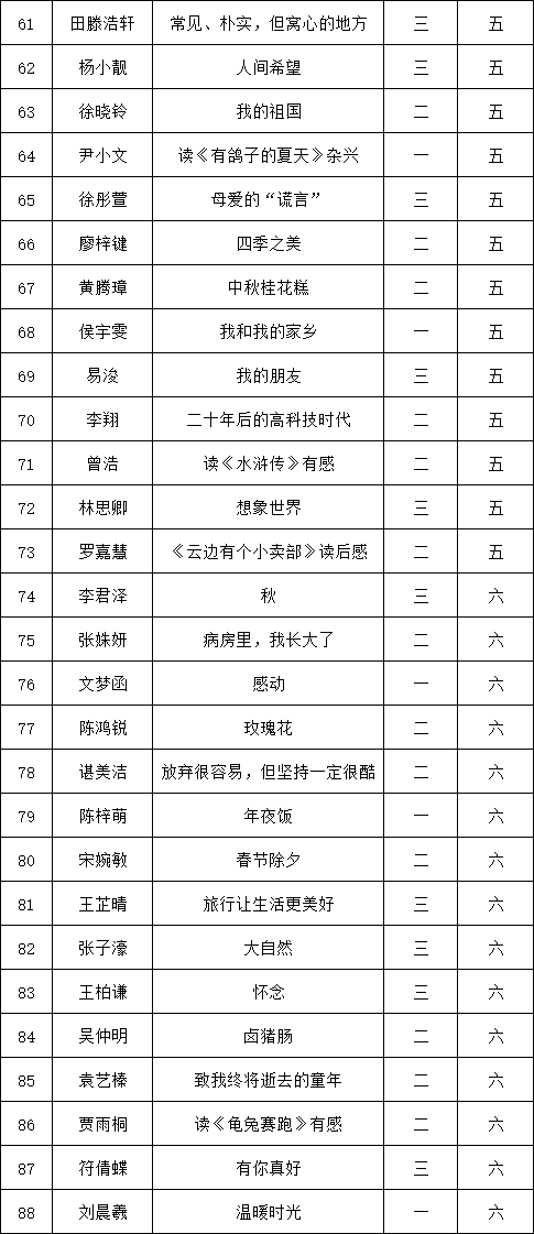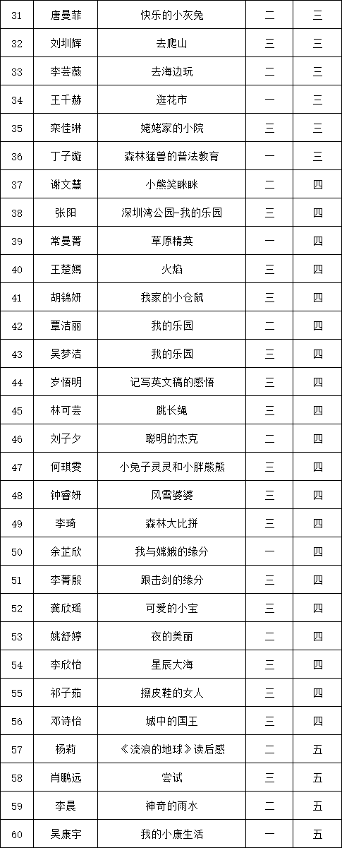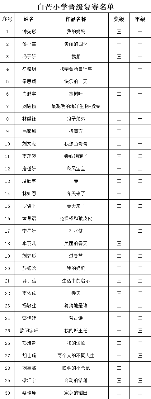 自2021年1月,活動(dòng)征稿啟動(dòng)以來(lái),獲得了深圳市廣大中小學(xué)生、教師、文學(xué)愛(ài)好者的熱烈響應(yīng)積極參與,吸引了深圳百余所學(xué)校的上萬(wàn)人關(guān)注報(bào)名?,F(xiàn)公布深圳市南山實(shí)驗(yàn)教育集團(tuán)白芒小學(xué)專(zhuān)場(chǎng)晉級(jí)復(fù)賽名單如下: