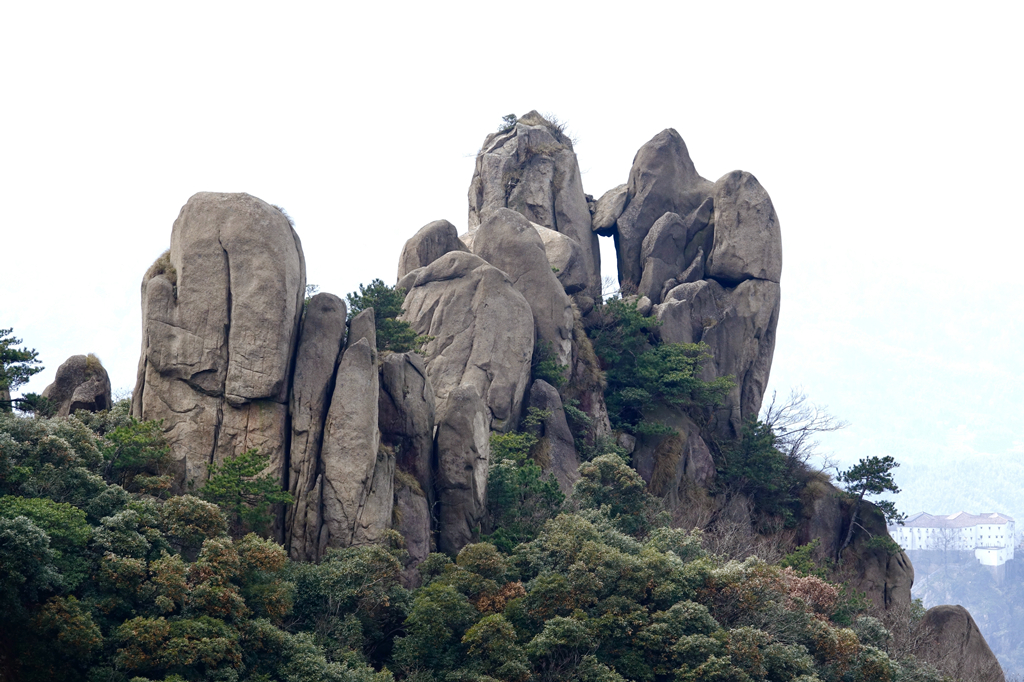 由于其隆起幅度自核心部位向周?chē)饾u減小,外圍山地由硬度較花崗巖小的花崗閃長(zhǎng)巖和沉積巖組成,易被沖刷蝕低,故整個(gè)九華山體由眾多千姿百態(tài)、高低參差的中山、低山、丘陵和山間盆地等組成。李仁奇 攝