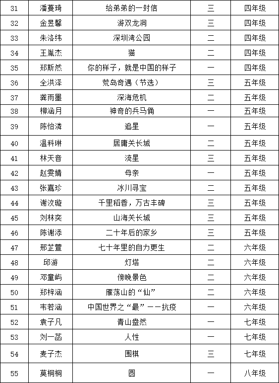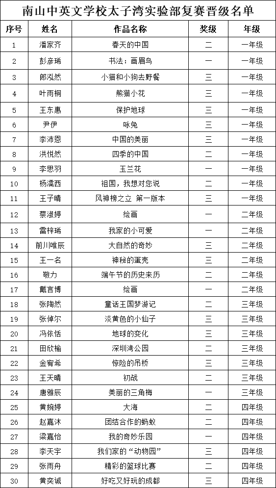 自2021年1月,活動(dòng)征稿啟動(dòng)以來(lái),獲得了深圳市廣大中小學(xué)生、教師、文學(xué)愛(ài)好者的熱烈響應(yīng)積極參與,吸引了深圳百余所學(xué)校的上萬(wàn)人關(guān)注報(bào)名。現(xiàn)公布南山中英文學(xué)校太子灣實(shí)驗(yàn)部晉級(jí)復(fù)賽名單如下: