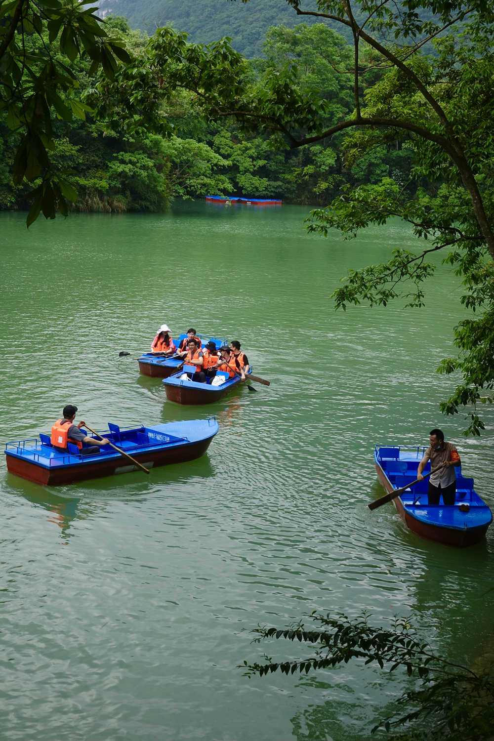 鴛鴦湖是由兩個大湖和四個小湖串聯(lián)起來的水網(wǎng),屬于高原喀斯特湖泊。泛舟湖中,感覺心靈都被洗凈了。李仁奇 攝