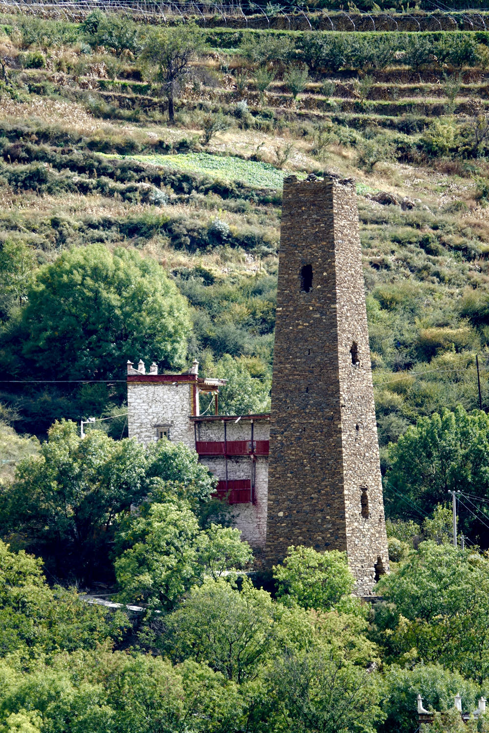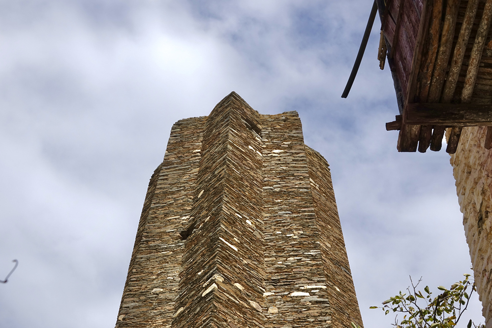 古碉為片石或石塊夾泥砌成,棱角筆直,墻面光滑,下寬上窄,一般高20余米,最高達(dá)50米,內(nèi)建樓層十余層至二十余層,每層可容納10余人。李仁奇 攝