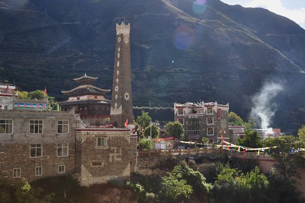 在它的后面三個(gè)碉樓特別吸引眼球。左邊第一座是五角碉,第二座是八角碉,第三座是常見(jiàn)的四角碉。李仁奇 攝