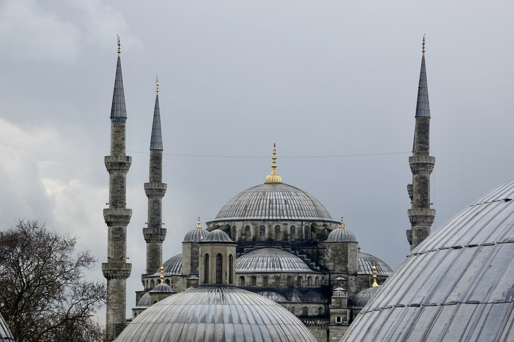 公元1453年,奧斯曼土耳其蘇丹下令將將君士坦丁堡改名為伊斯坦布爾,將索菲亞大教堂改成阿雅索菲亞清真寺,并將教堂內(nèi)所有拜占庭的壁畫(huà)全部用灰漿遮蓋住,所有基督教雕像也被搬出,還在周圍修建了4個(gè)高大的宣禮塔。李仁奇 攝