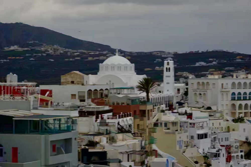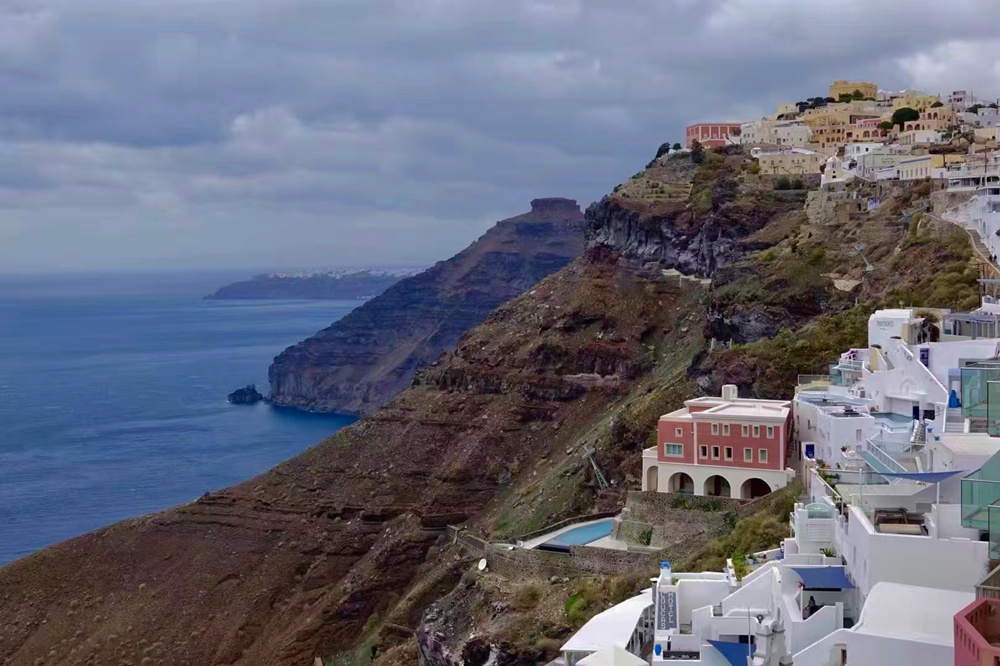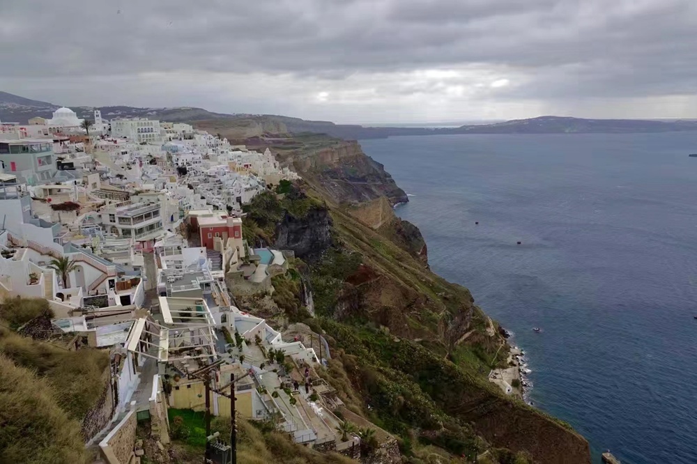 費(fèi)拉碼頭附近有許多懸崖,無(wú)數(shù)的白色小屋依山而建,與天空、海洋混成一體,這是地中海獨(dú)有的景觀。李仁奇 攝